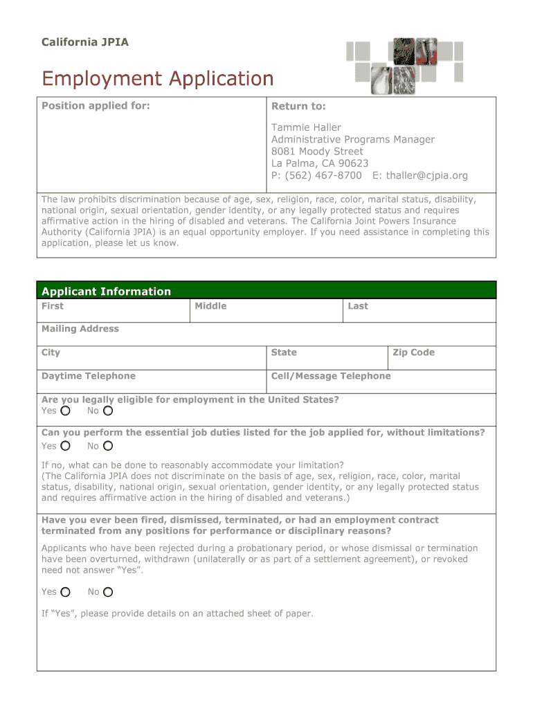 California APIA Employment Application Position applied for: Return to: Tammie Haller Administrative Programs Manager 8081 Moody Street La Palma, CA 90623 P: (562× 4678700 E: taller CIA.org The law