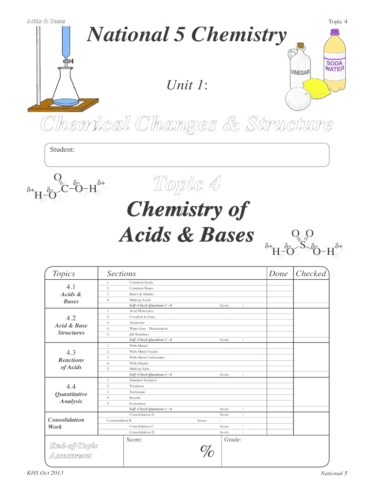 National 5 Chemistry Acids & Bases Topic 4 Unit 1: Chemical Changes & Structure Student: Topic 4 Chemistry of Acids & Bases O dd+ d+ d C O H H O Topics 4.1 Acids & Bases 4.2 Acid & Base Structures