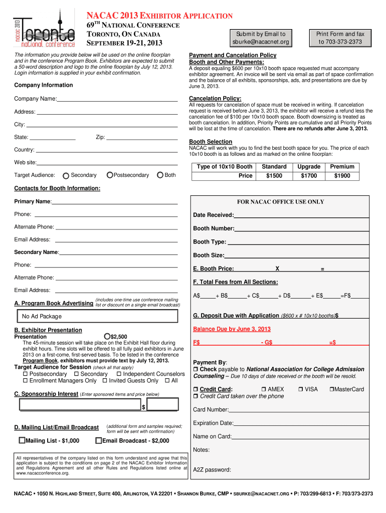 This document serves as an application for exhibitors wishing to participate in the NACAC 2013 National Conference in Toronto, detailing payment, cancellation policies, booth selection, and other