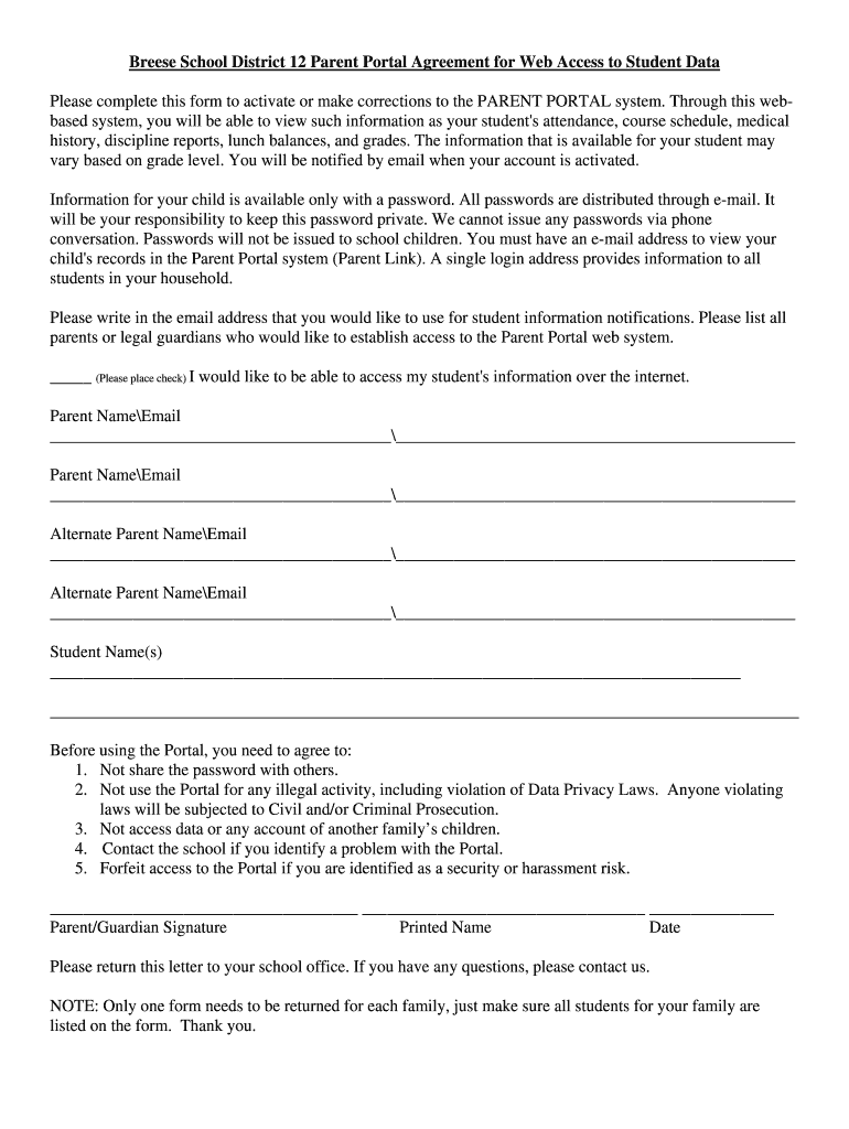 Get the free Breese School District 12 Parent Portal Agreement for Web Access to Student Data