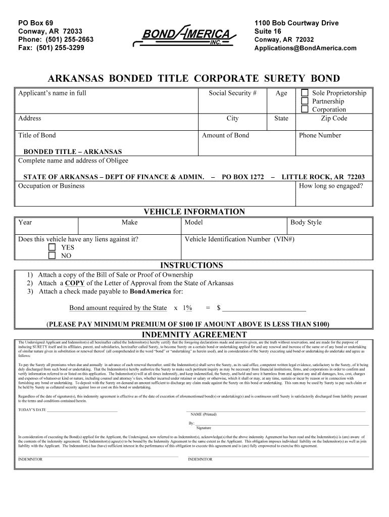 PO Box 69 Conway, AR 72033 Phone: (501× 2552663 Fax: (501× 2553299 1100 Bob Court way Drive Suite 16 Conway, AR 72032 Applications BondAmerica.com ARKANSAS BONDED TITLE CORPORATE SURETY BOND Applicants
