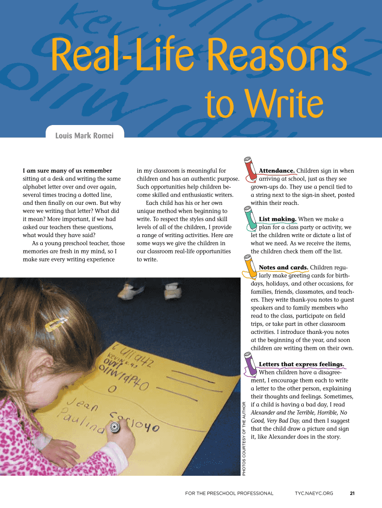 This document provides insights and strategies for preschool teachers to encourage writing in children by giving them real-life opportunities to express themselves and develop literacy skills.