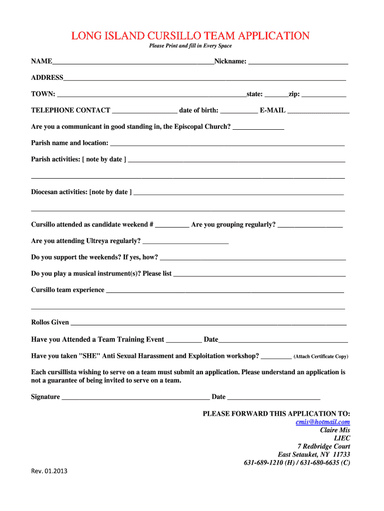 LONG ISLAND CARRILLO TEAM APPLICATION Please Print and fill in Every Space NAME Nickname: ADDRESS TOWN: state: zip: TELEPHONE CONTACT date of birth: EMAIL Are you a communicant in good standing in,