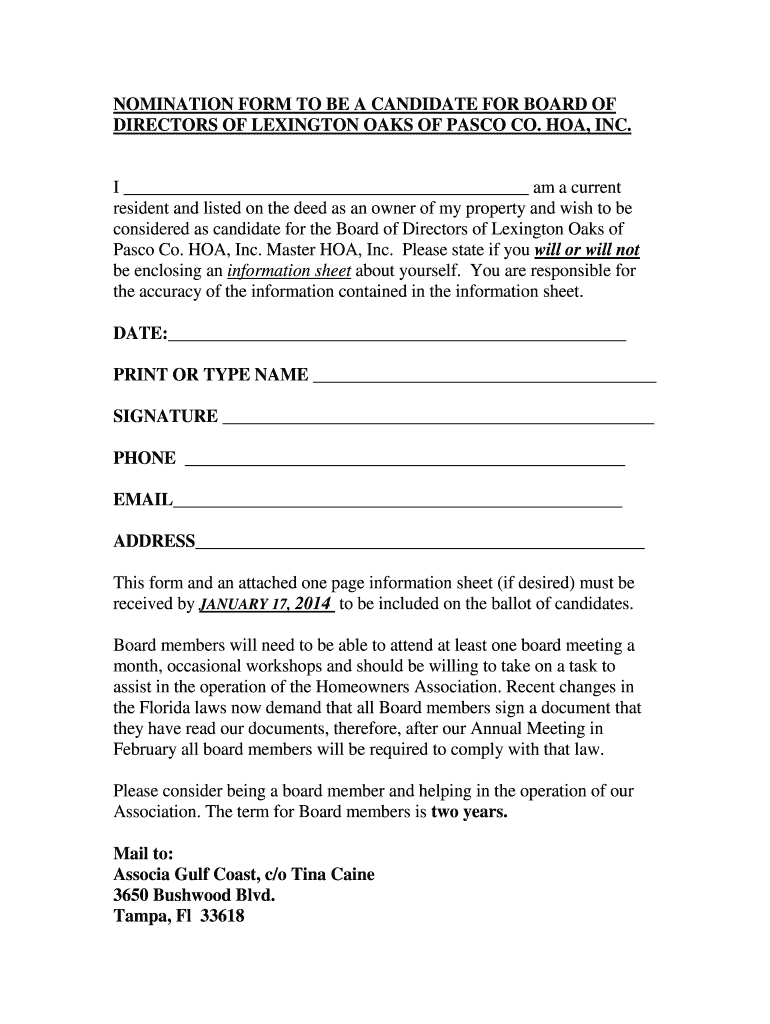 NOMINATION FORM TO BE A CANDIDATE FOR BOARD OF DIRECTORS OF LEXINGTON OAKS OF PASCO CO. HOA, INC. I am a current resident and listed on the deed as an owner of my property and wish to be considered
