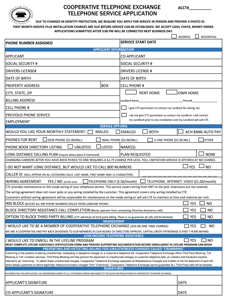 COOPERATIVE TELEPHONE EXCHANGE TELEPHONE SERVICE APPLICATION ACCT# DUE TO CHANGES IN IDENTITY PROTECTION, WE REQUIRE YOU APPLY FOR SERVICE IN PERSON AND PROVIDE A PHOTO ID. FIRST MONTH SERVICE PLUS