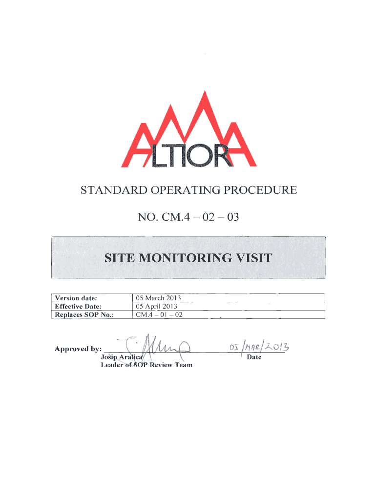 SITE MONITORING VISIT No: CM.4 02 03 Effective Date: 05 April 2013 Version Date: 05 March 2013 CONTENTS: 1. DEFINITIONS×REFERENCES2. 2. PURPOSE3. 3. SCOPE.3. 4. RESPONSIBILITIES.3. 5. PROCEDURES