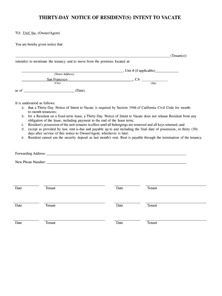 THIRTY NOTICE OF RESIDENT’S) INTENT TO VACATE TO: Unit, Inc. (Owner×Agent) You are hereby given notice that (Tenant’s)) intends) to terminate the tenancy and to move from the premises located