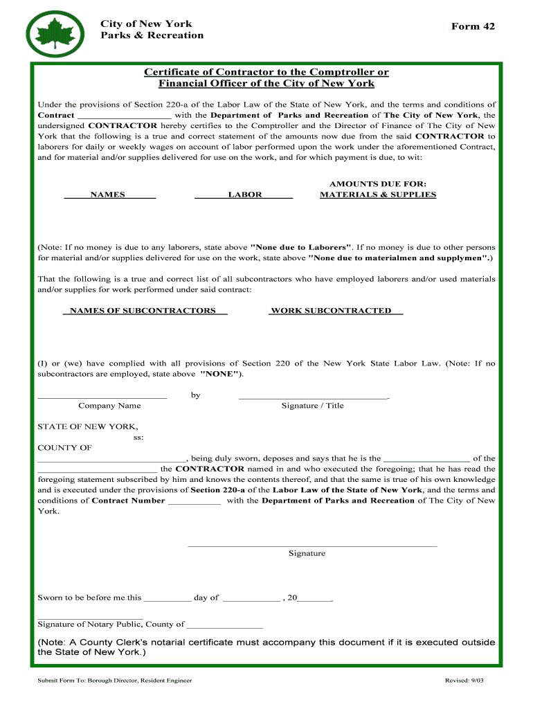 The New York Contractor Certificate, also referred to as City of New York Form 42, is essential for certifying amounts due to laborers, suppliers, and subcontractors involved in a project. This form ensures compliance with New York State Labor Law and facilitates payment transparency among all parties involved.