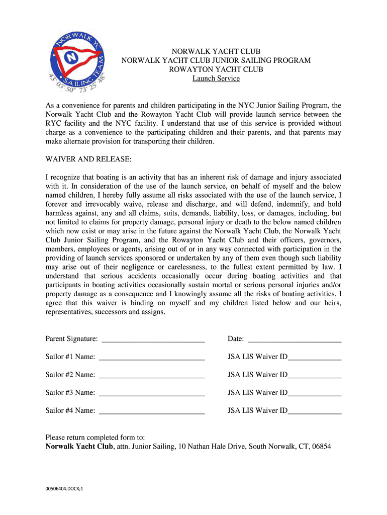 NORWALK YACHT CLUB NORWALK YACHT CLUB JUNIOR SAILING PROGRAM ROTATION YACHT CLUB Launch Service As a convenience for parents and children participating in the NYC Junior Sailing Program, the Norwalk