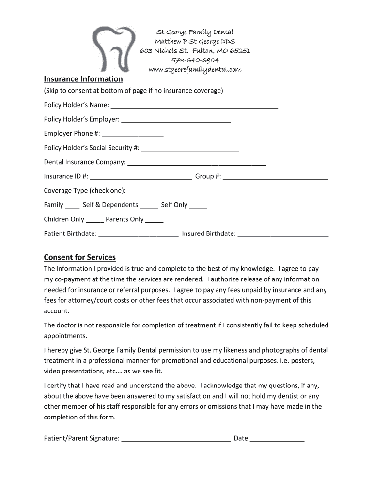 Get the free Insurance Information Consent for Services - St. George Family Dental