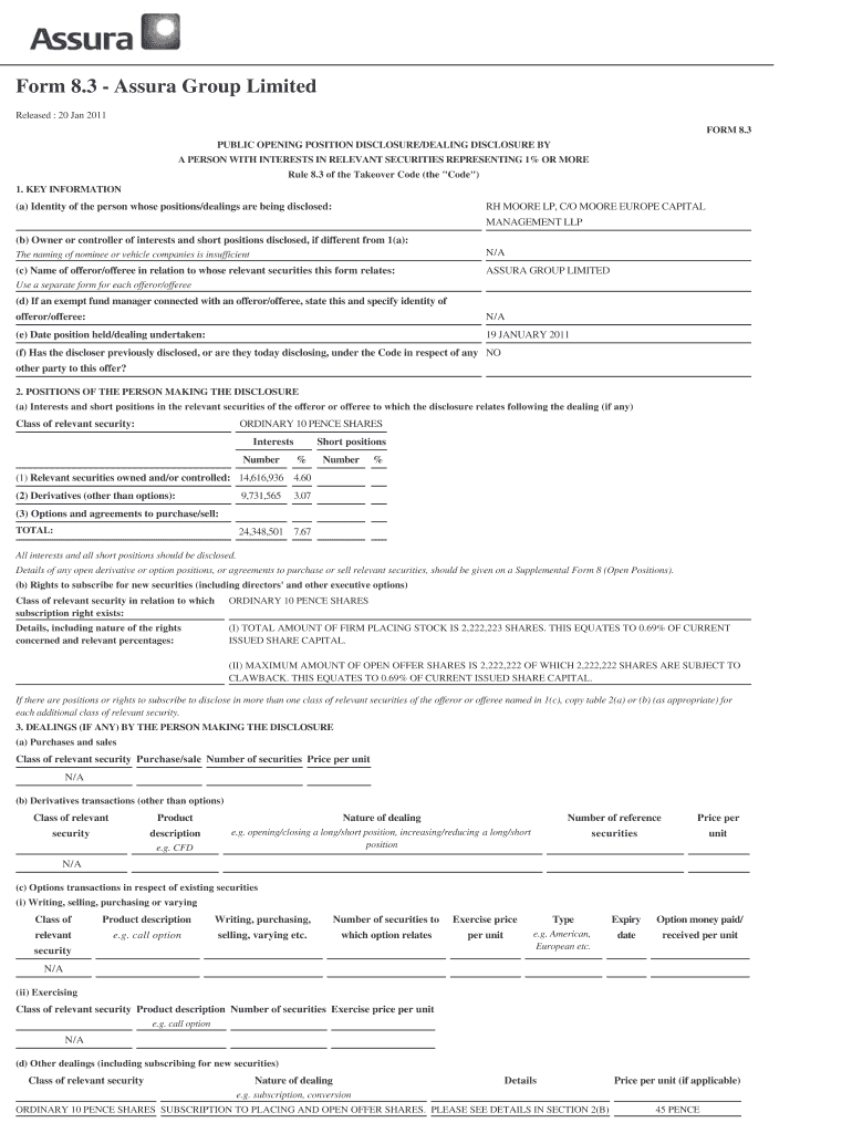 Form 8.3 Assure Group Limited Released : 20 Jan 2011 FORM 8.3 PUBLIC OPENING POSITION DISCLOSURE×DEALING DISCLOSURE BY A PERSON WITH INTERESTS IN RELEVANT SECURITIES REPRESENTING 1% OR MORE Rule