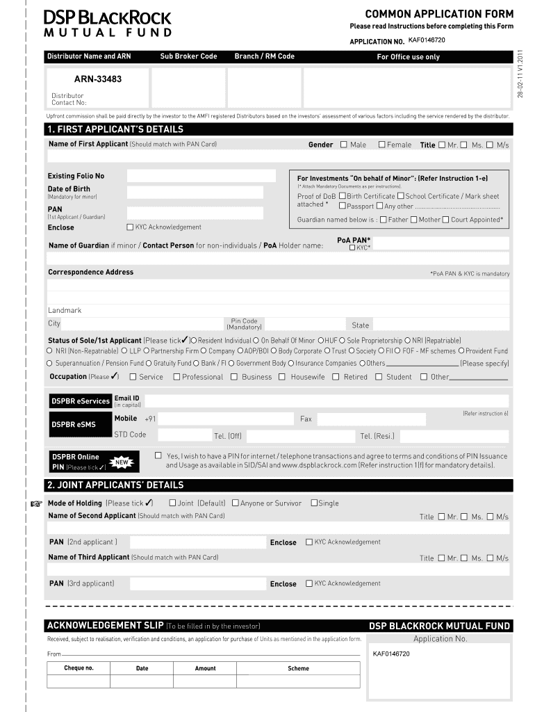 COMMON APPLICATION FORM Please read Instructions before completing this Form Distributor Name and ARN Sub Broker Code Branch / RM Code 280211 V1.2011 APPLICATION NO. KAF0146720 For Office use only