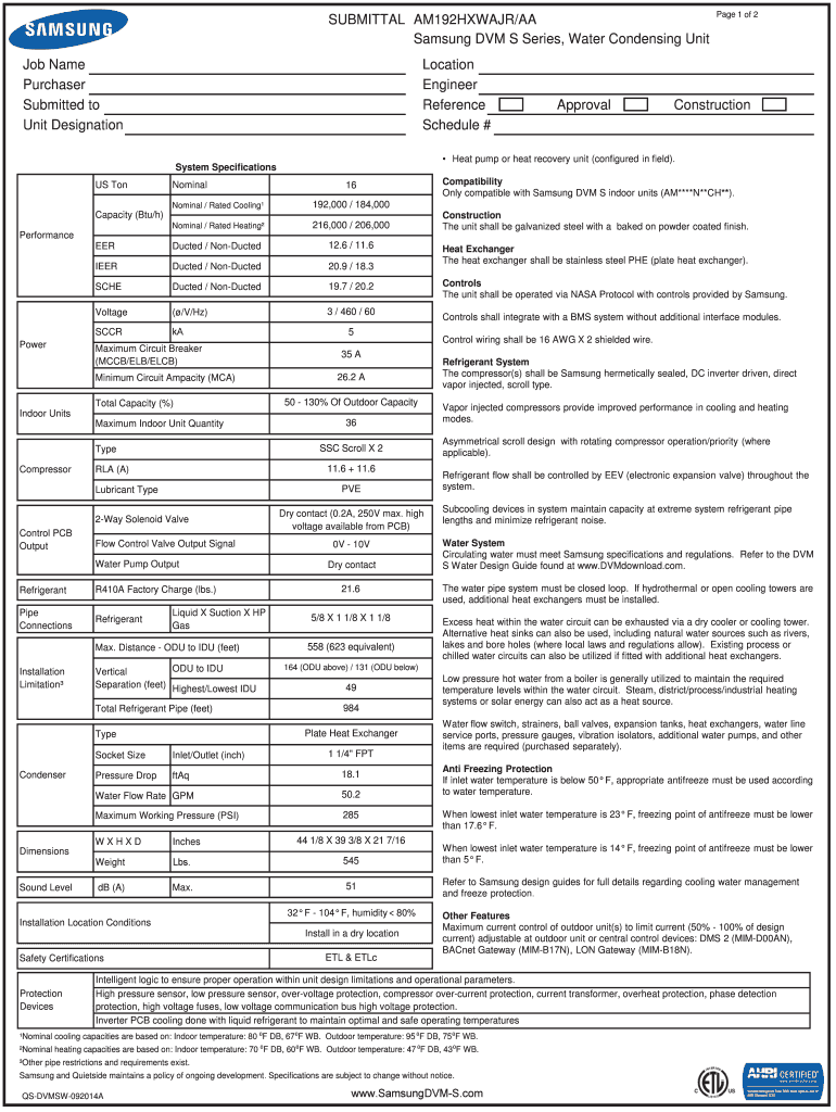 SUBMITTAL AM192HXWAJR×AA Samsung DVM S Series, Water Condensing Unit Job Name Purchaser Submitted to Unit Designation Location Engineer Reference Schedule # Nominal 16 Nominal / Rated Cooling Nominal