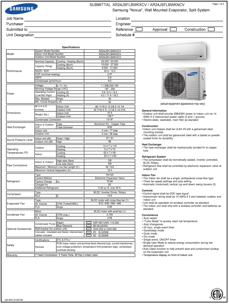 SUBMITTAL AR JS LBWKXCV / AR JS LBWKNCV Samsung “, Wall Mounted Evaporator, Split System Page 1 of 3 Specifications Model System Model Number Indoor Unit Model Number Outdoor Unit Model Number Nominal