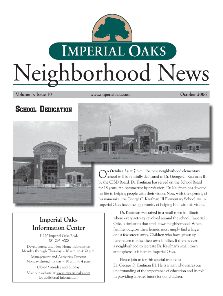 Neighborhood News Volume 3, Issue 10 www.imperialoaks.com October 2006 School Dedication O n October 24 at 7 p.m., the new neighborhood elementary school will be officially dedicated to Dr. George