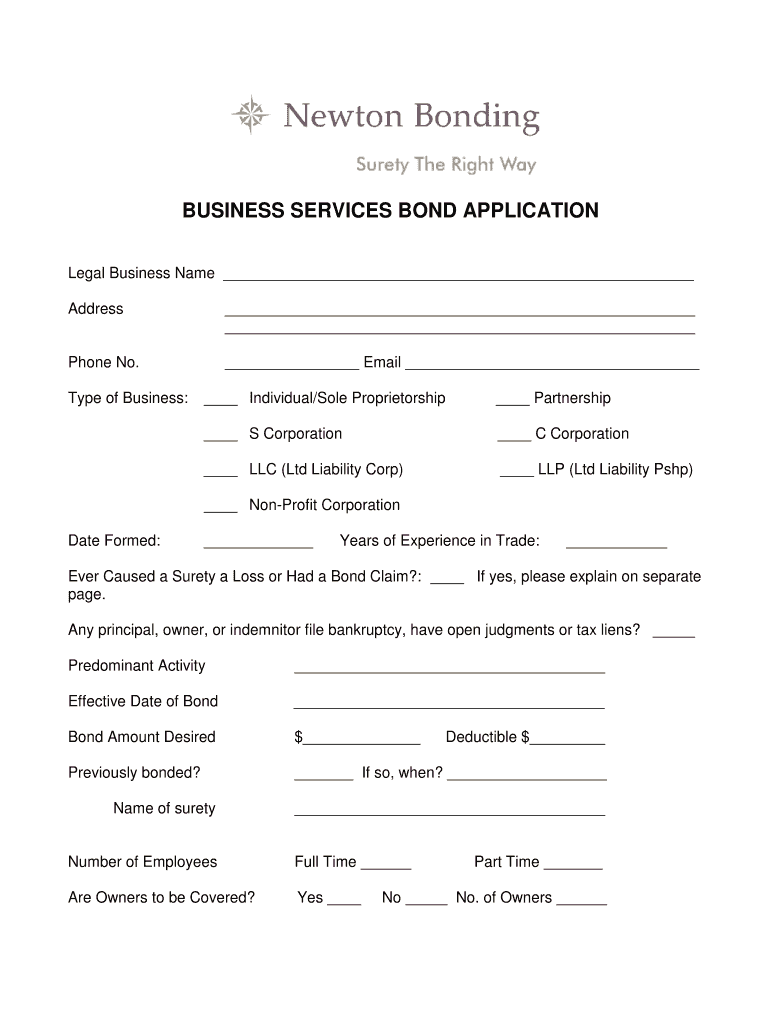 Get the free BUSINESS SERVICES BOND APPLICATION - Newton Bonding