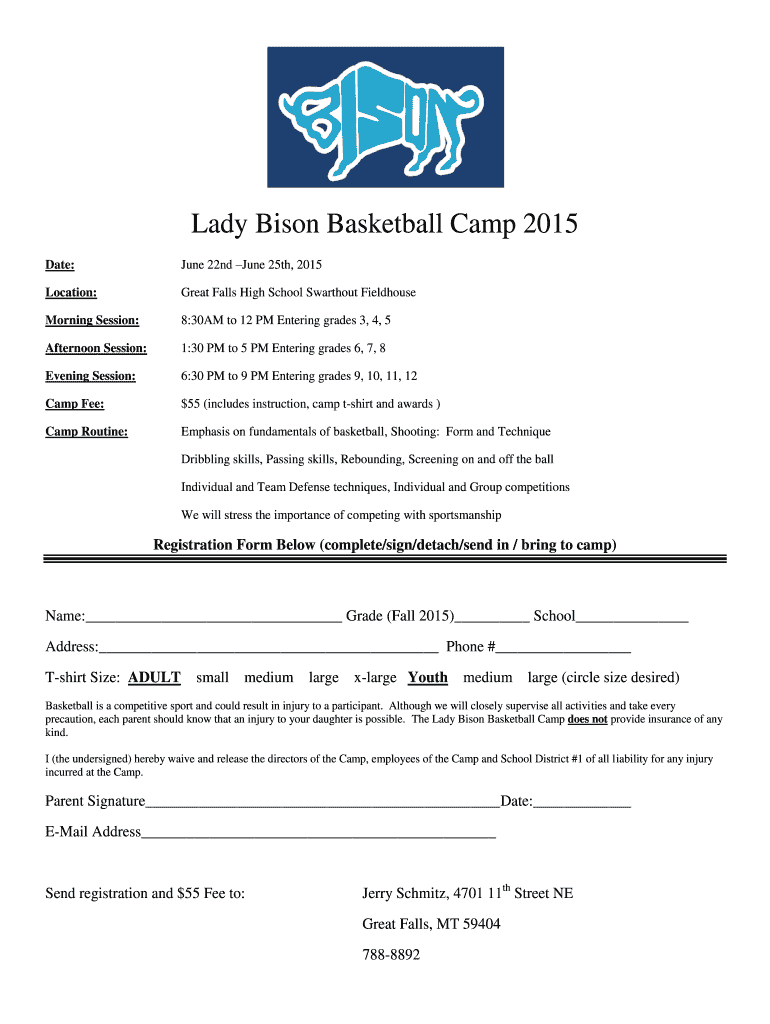 Lady Bison Basketball Camp 2015 Date: June 22nd June 25th, 2015 Location: Great Falls High School Without Field house Morning Session: 8:30AM to 12 PM Entering grades 3, 4, 5 Afternoon Session: 1:30