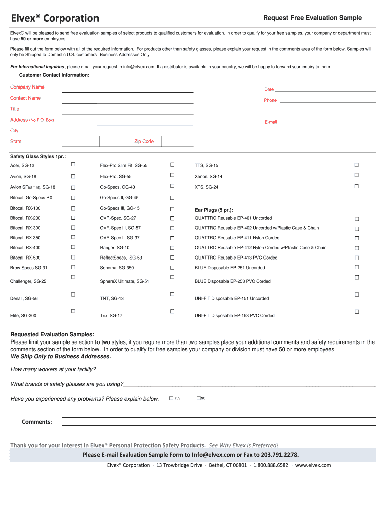 Elves Corporation Request Free Evaluation Sample Elves will be pleased to send free evaluation samples of select products to qualified customers for evaluation. In order to qualify for your free samples,