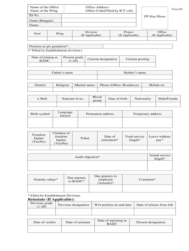 Name of the Office Name of the Wing : Office Address: Office Code×Filled by ICT cell) Form02 ID No. PP Size Photo Name (Bengali): Name: Pool Division (If Applicable) Wing Project (If Applicable)