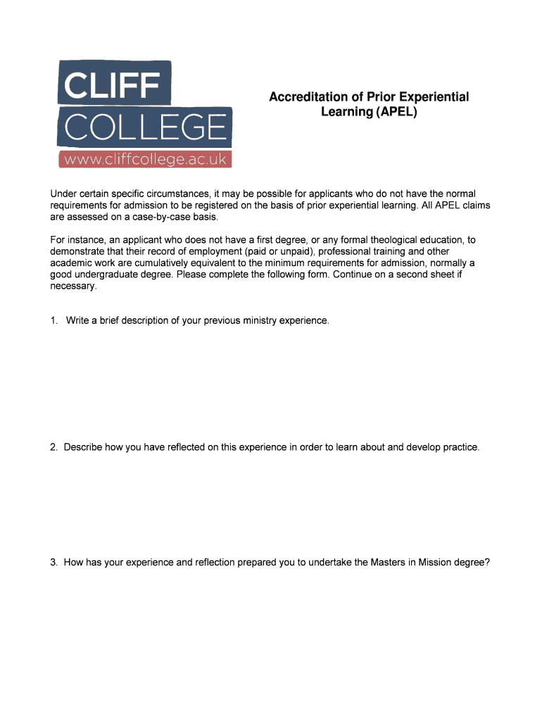 Get the free Accreditation of prior experiential learning (apel) - Cliff College - cliffcollege ac