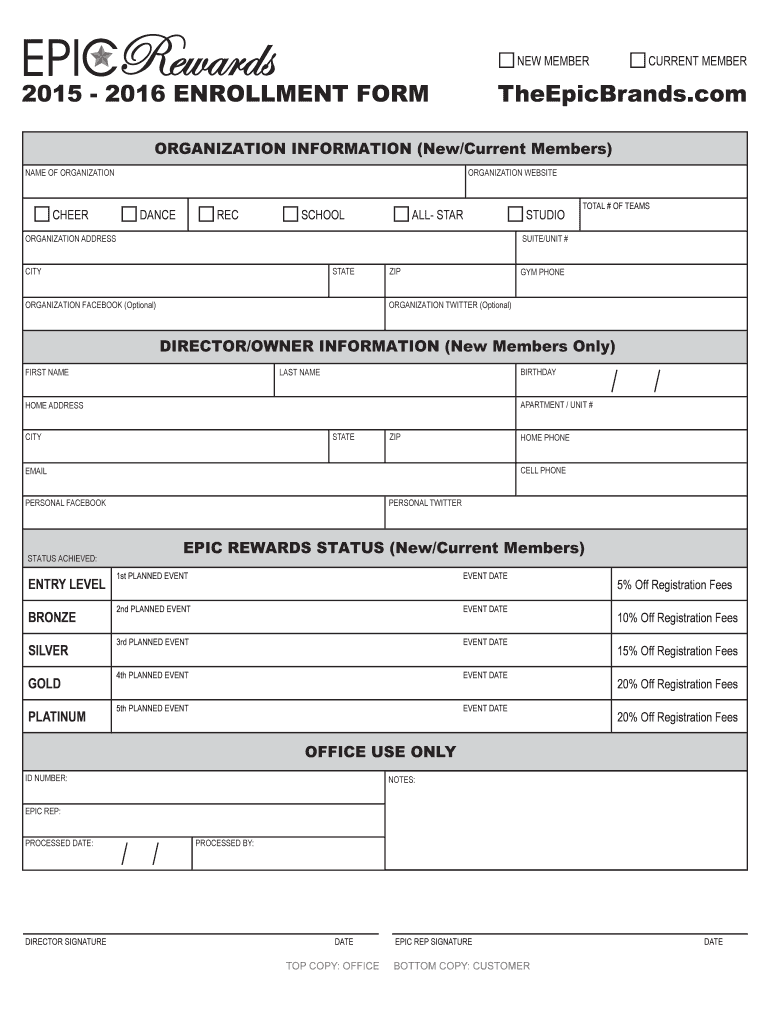 ORGANIZATION INFORMATION (New×Current Members) 2015 2016 ENROLLMENT FORM TheEpicBrands.com DIRECTOR×OWNER INFORMATION (New Members Only) EPIC REWARDS STATUS (New ...