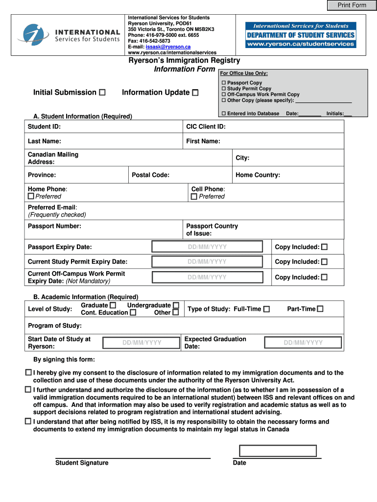 This form is used to collect information from international students regarding their immigration documents and academic status at Ryerson University for the purpose of support and regulation compliance.