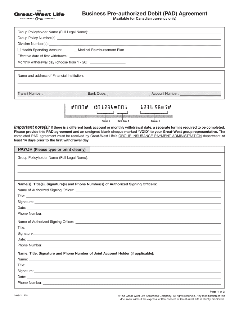 Business Preauthorized Debit (PAD) Agreement (Available for Canadian currency only) Group Policyholder Name (Full Legal Name): Group Policy Number’s): Division Number’s): Health Spending Account