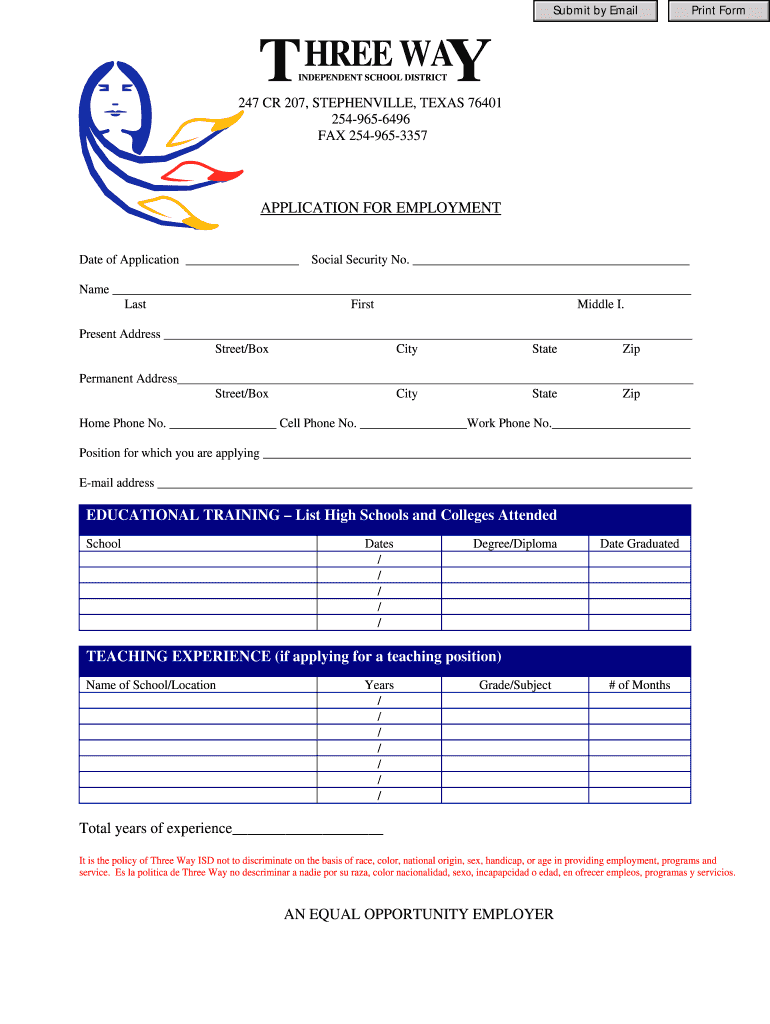 Submit by Email Print Form T THREE WAY INDEPENDENT SCHOOL DISTRICT 247 CR 207, STEUBENVILLE, TEXAS 76401 2549656496 FAX 2549653357 APPLICATION FOR EMPLOYMENT Date of Application Social Security No.