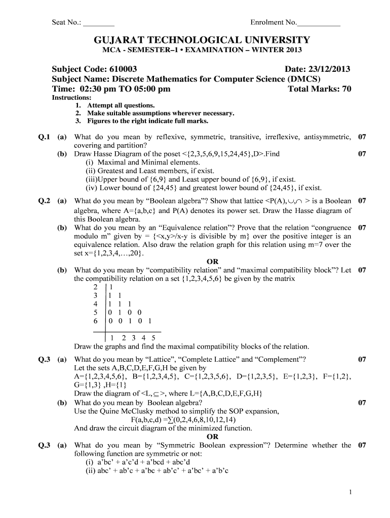 Seat No.: Enrollment No. GUJARAT TECHNOLOGICAL UNIVERSITY MCA SEMESTER1 EXAMINATION WINTER 2013 Subject Code: 610003 Date: 23×12/2013 Subject Name: Discrete Mathematics for Computer Science (DMC)