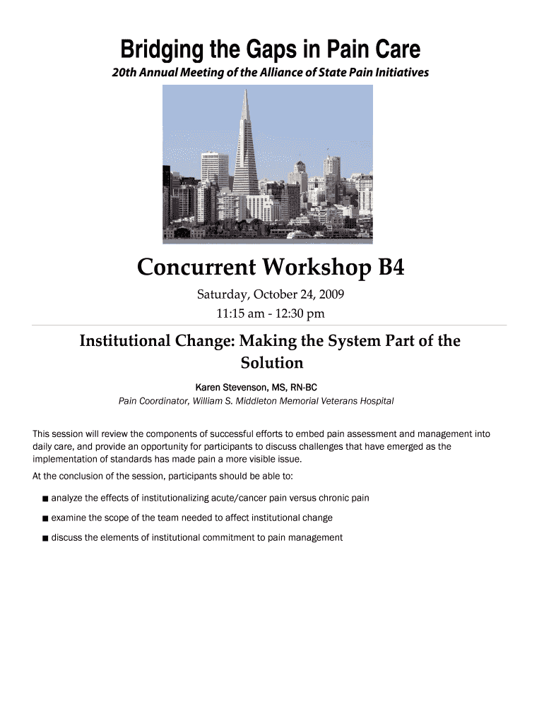 Bridging the Gaps in Pain Care 20th Annual Meeting of the Alliance of State Pain Initiatives Concurrent Workshop B4 Saturday, October 24, 2009 11:15 am 12:30 pm Institutional Change: Making the System