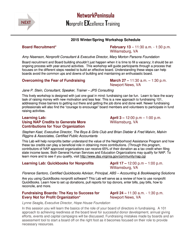 NetworkPeninsula Nonprofit Excellence Training 2015 Winter×Spring Workshop Schedule Board Recruitment* February 13 11:30 a.m. 1:30 p.m. Williamsburg, VA Amy Nielson, Nonprofit Consultant & Executive