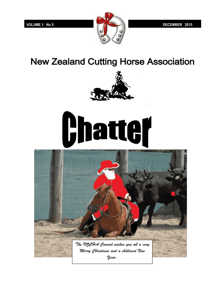 VOLUME 1. No 5 DECEMBER 2015 New Zealand Cutting Horse Association The NCAA Council wishes you all a very Merry Christmas and a chill axed New Year. NEW ZEALAND CUTTING HORSE ASSOCIATION PRESIDENT