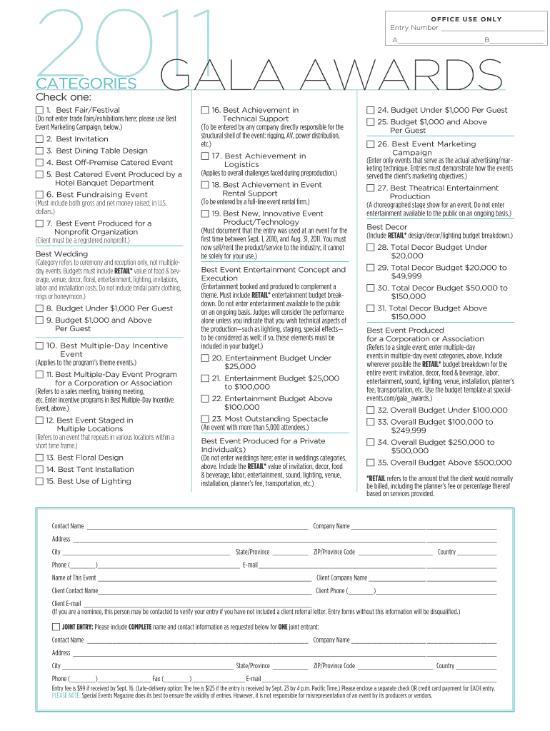 Get the free Office use Only 2011 GALA AWARDS - specialeventscom