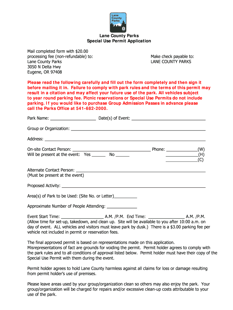 The Lane County Special Use Permit Application is a government form used by organizations to request permission to hold events in Lane County Parks.