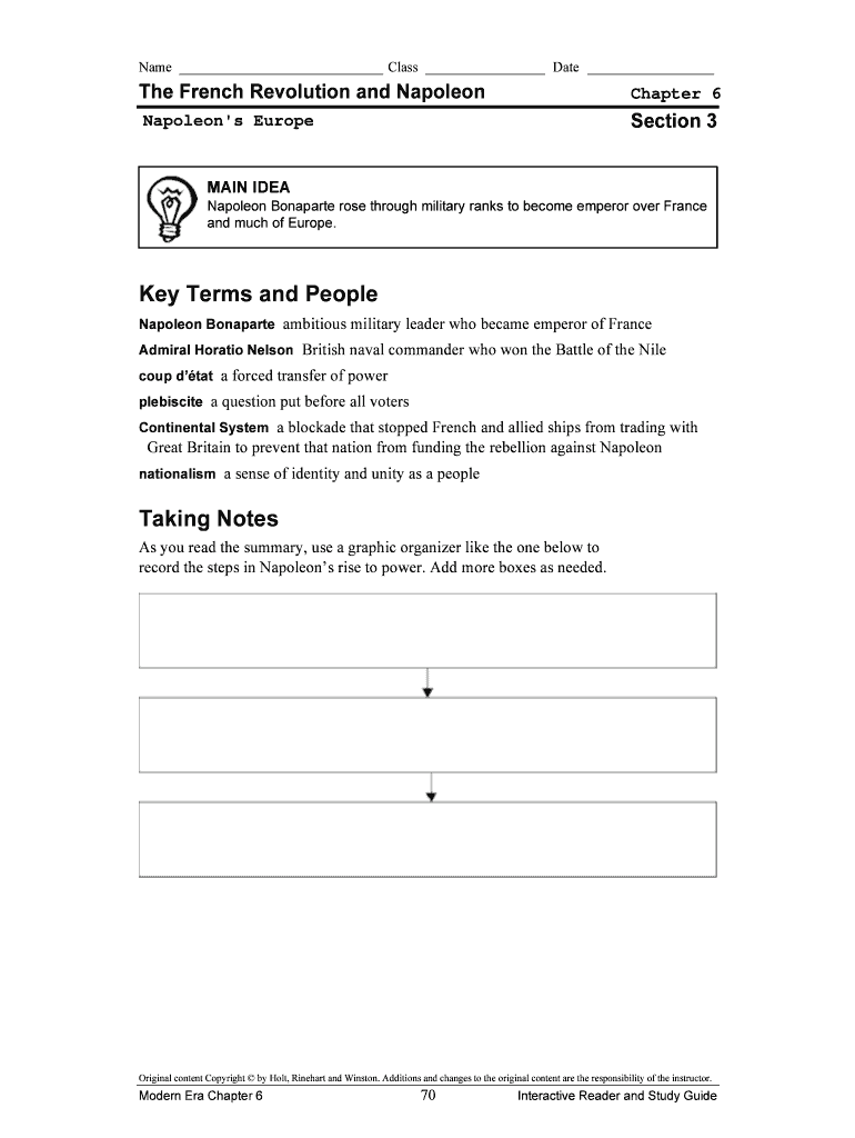 Name Class Date The French Revolution and Napoleon Chapter 6 Napoleon's Europe Section 3 MAIN IDEA Napoleon Bonaparte rose through military ranks to become emperor over France and much of Europe.