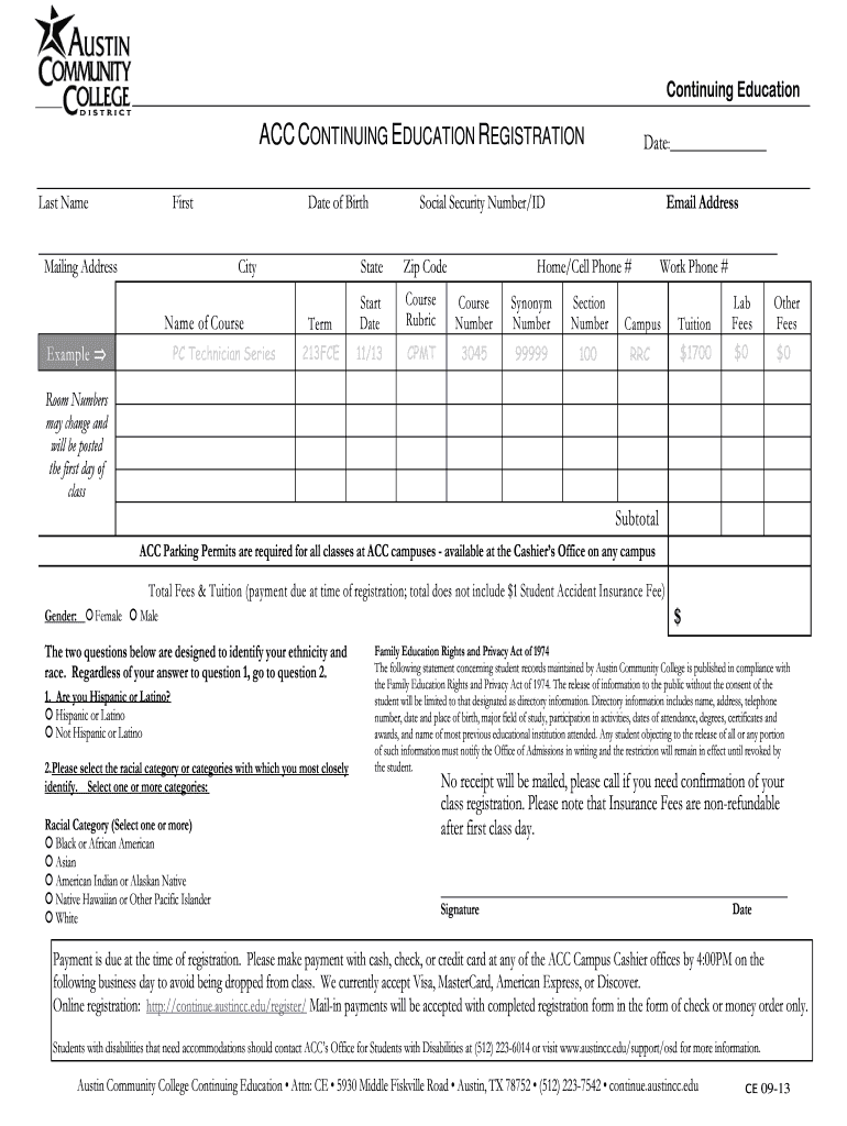 Any student wishing to enroll in continuing education courses at Austin Community College is eligible to fill out this form. Parents or guardians can also fill out the form on behalf of students.