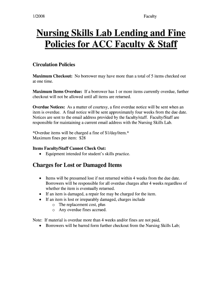 This document outlines the circulation policies, overdue notices, fines for overdue items, and procedures for lost or damaged items for faculty and staff borrowing from the Nursing Skills Lab.