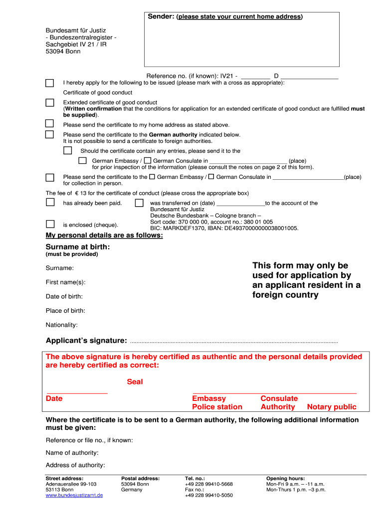 Sender: (please state your current home address) Bundesrat for Justin Bundeszentralregister Sachgebiet IV 21 / IR 53094 Bonn Reference no. (if known): IV21 D I hereby apply for the following to be