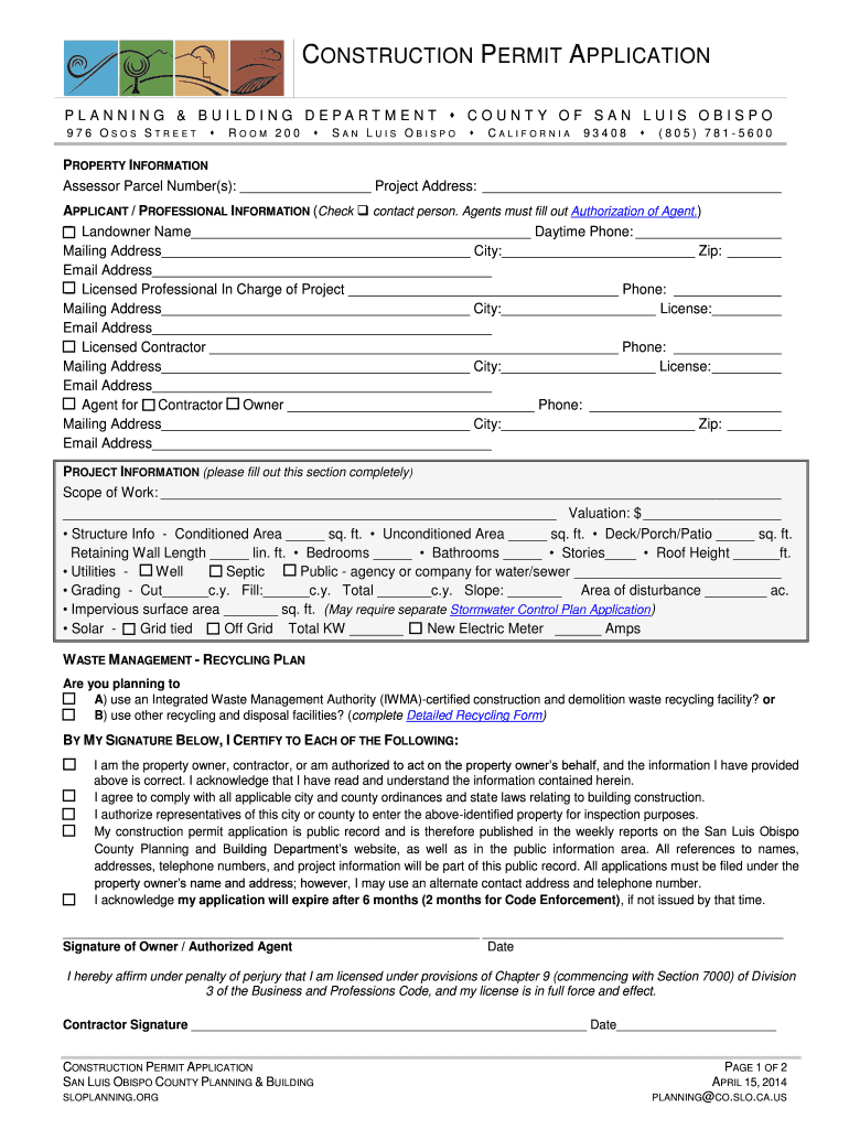 The Construction Permit Application can be submitted by property owners, contractors, or authorized agents involved in construction projects within San Luis Obispo County.