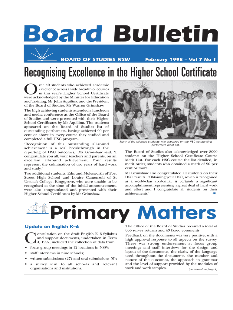 This document acknowledges the academic achievements of students in the Higher School Certificate, provides updates on the English K-6 syllabus, and outlines important dates for the HSC and School
