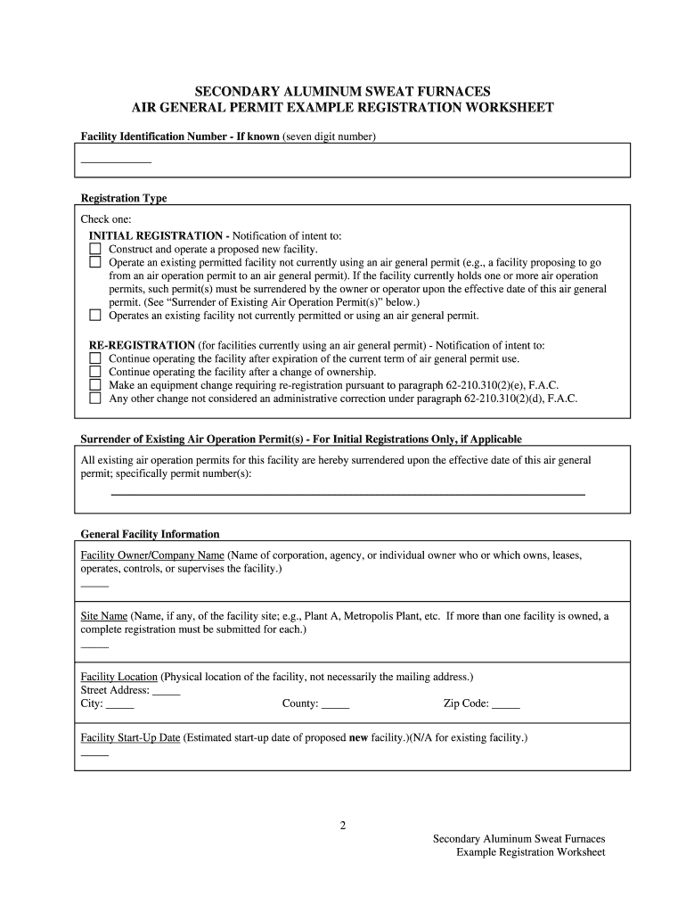 This document serves as a registration worksheet for facilities that wish to obtain an air general permit for secondary aluminum sweat furnaces as established by the Florida Department of Environmental