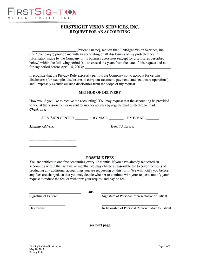FISTFIGHT VISION SERVICES, INC. REQUEST FOR AN ACCOUNTING I, Patients name, request that Fistfight Vision Services, Inc. (the Company) provide me with an accounting of all disclosures of my protected