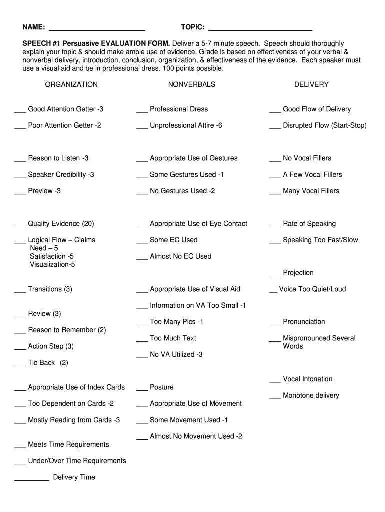 Get the free NAME TOPIC SPEECH 1 Persuasive EVALUATION FORM Deliver - speechsuccess