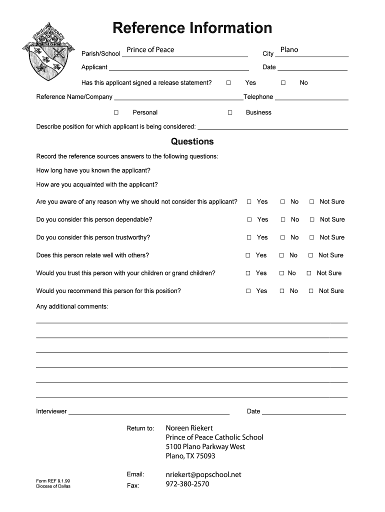 Get the free Reference Information - Prince of Peace Catholic School