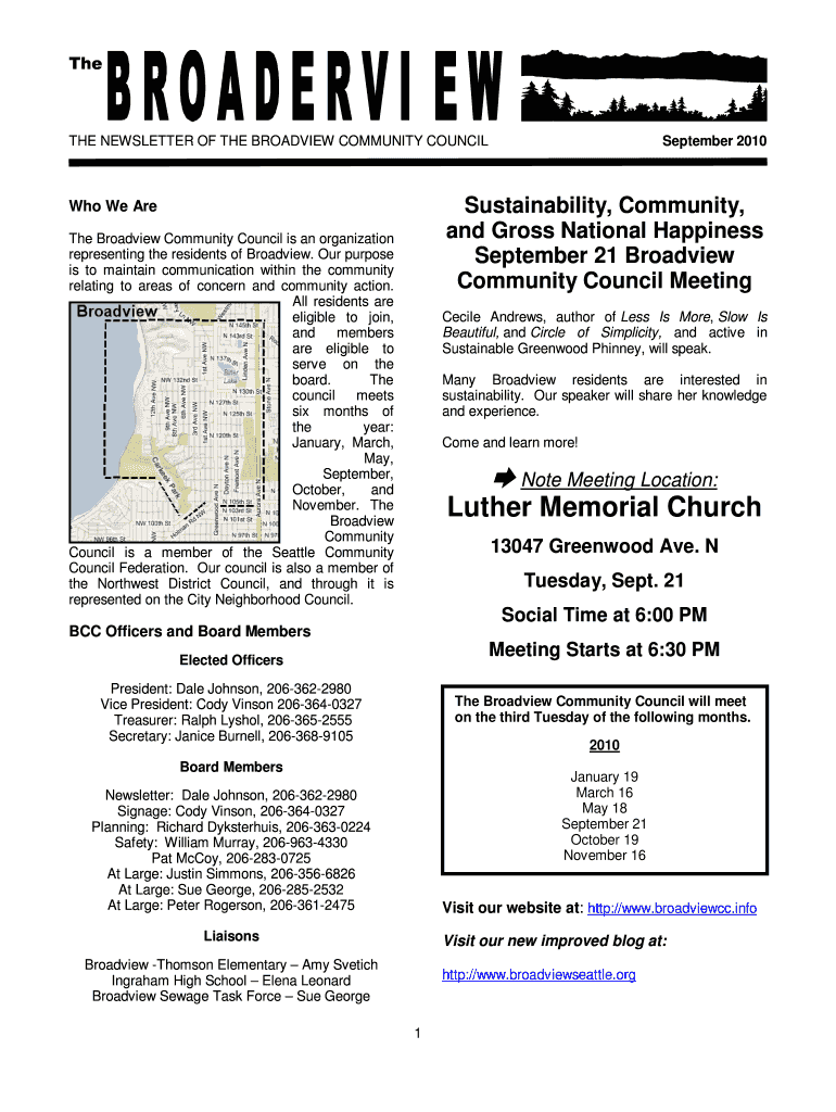 The NEWSLETTER OF THE BROADVIEW COMMUNITY COUNCIL September 2010 Sustainability, Community, and Gross National Happiness September 21 Broadview Community Council Meeting Who We Are The Broadview Community
