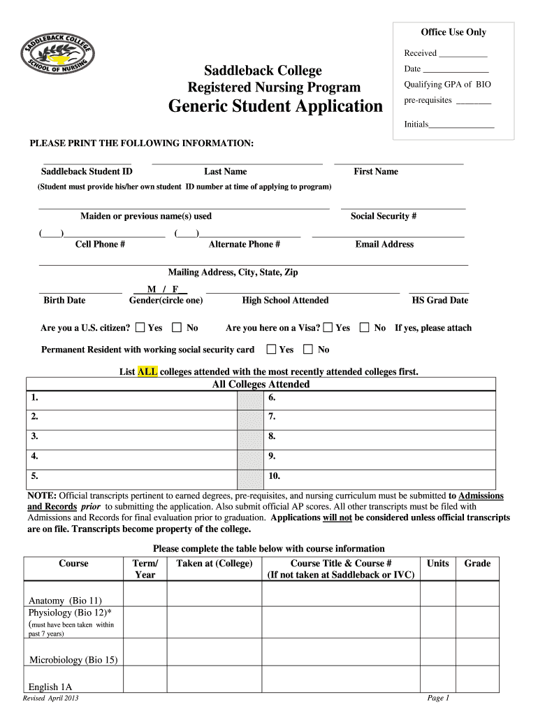Get the free Generic Student Application - saddleback