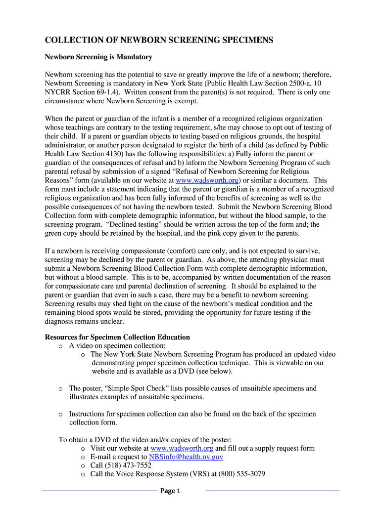 This document outlines the mandatory protocols and guidelines for collecting and processing newborn screening specimens in New York State, including consent, specimen collection procedures, and responsibilities