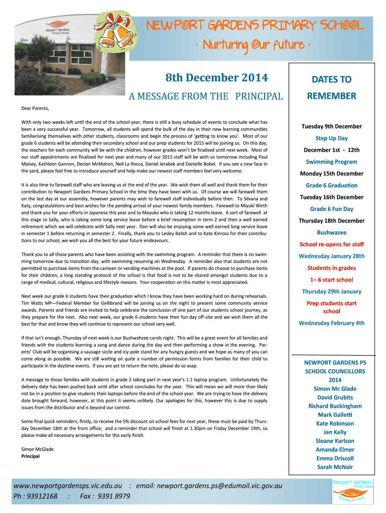 NEWPORT GARDENS PRIMARY SCHOOL Nurturing Our future 8th December 2014 A MESSAGE FROM THE PRINCIPAL DATES TO REMEMBER Dear Parents, With only two weeks left until the end of the school year, there