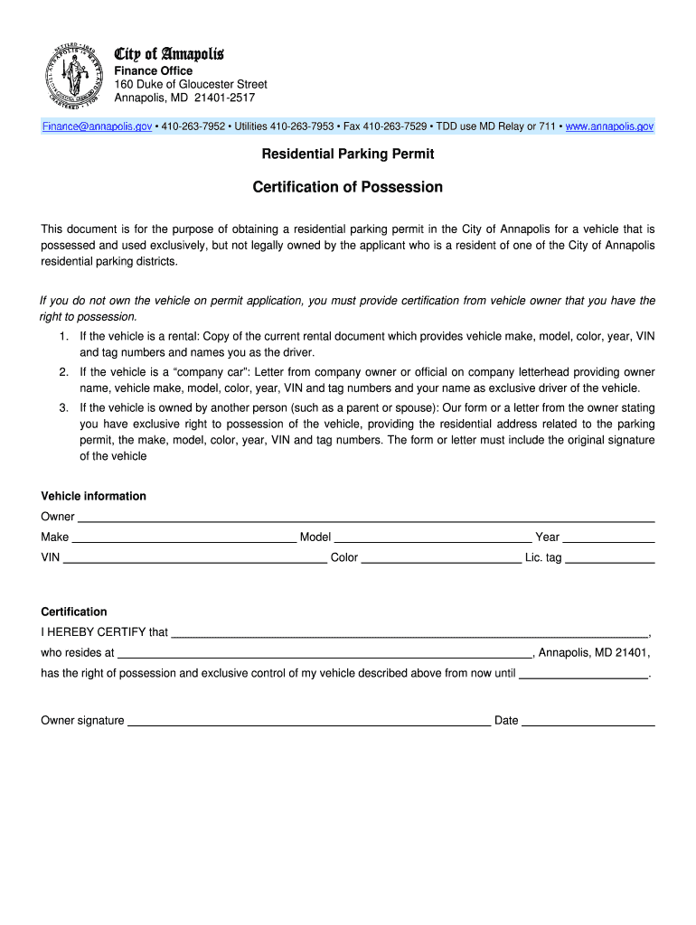 Residents of Annapolis, Maryland who possess a vehicle but do not legally own it can apply for this permit. Applicants must provide certification from the actual vehicle owner.