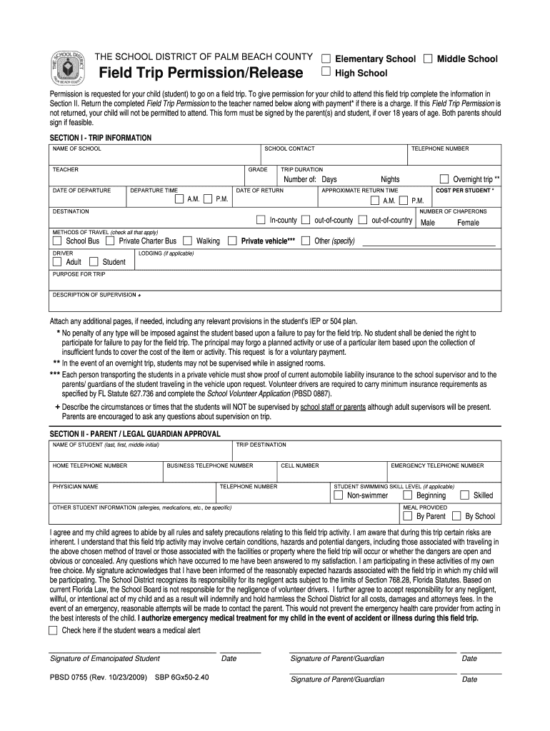 The Field Trip Permission Form is intended for parents or guardians of students who plan to attend a field trip organized by the School District of Palm Beach County.